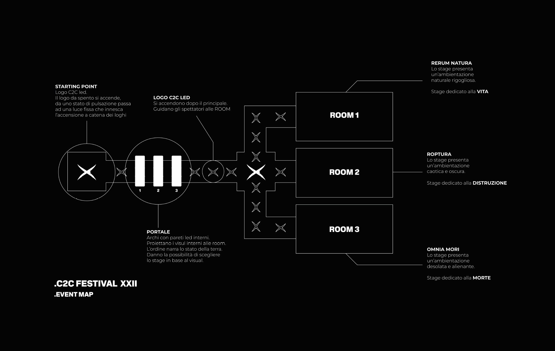 Il C2C Festival è un noto evento di musica elettronica e arte contemporanea che si tiene annualmente a Torino. In occasione del suo trasferimento da Torino a Roma, si è scelto di realizzare un progetto installativo per celebrare questo cambiamento.