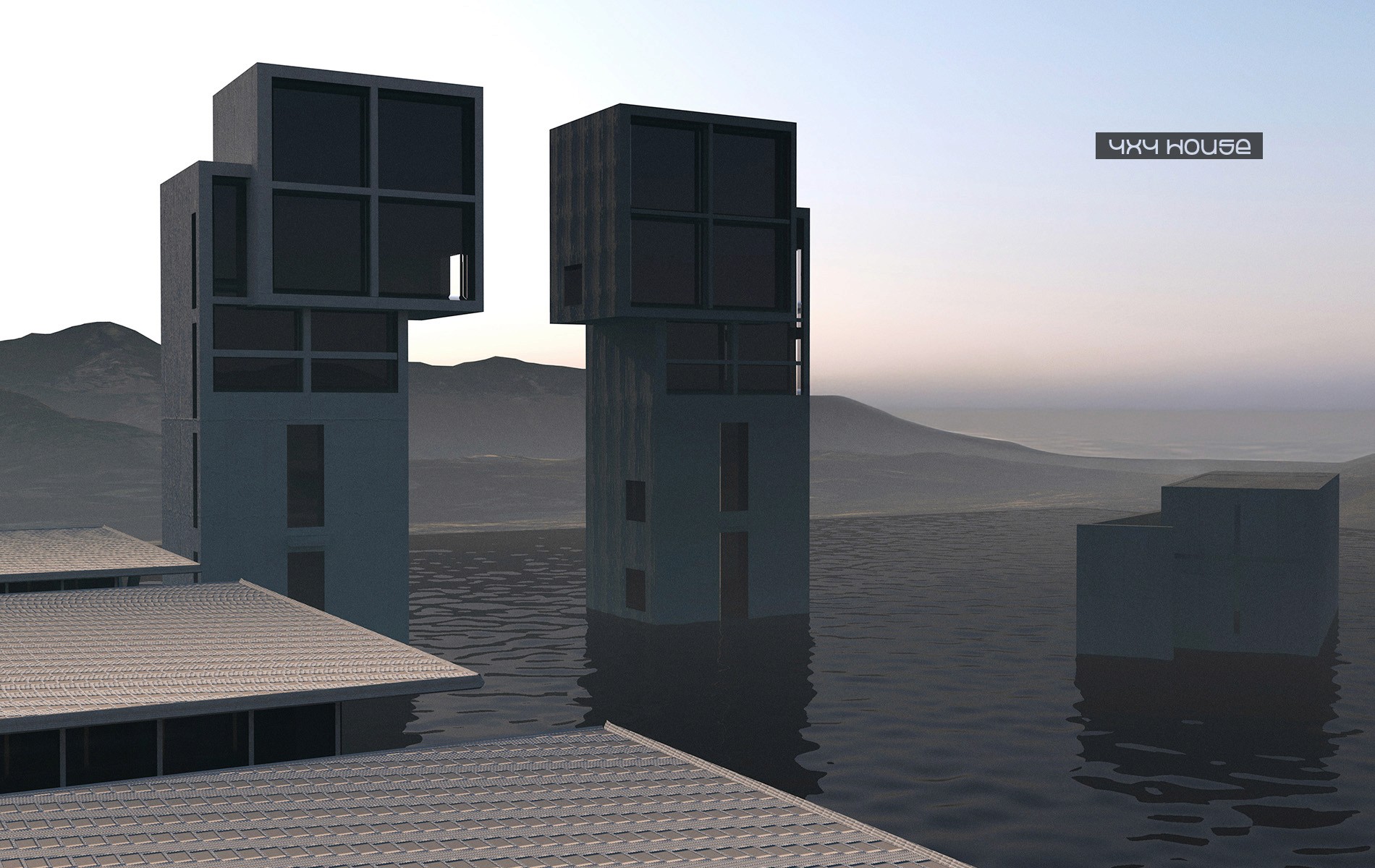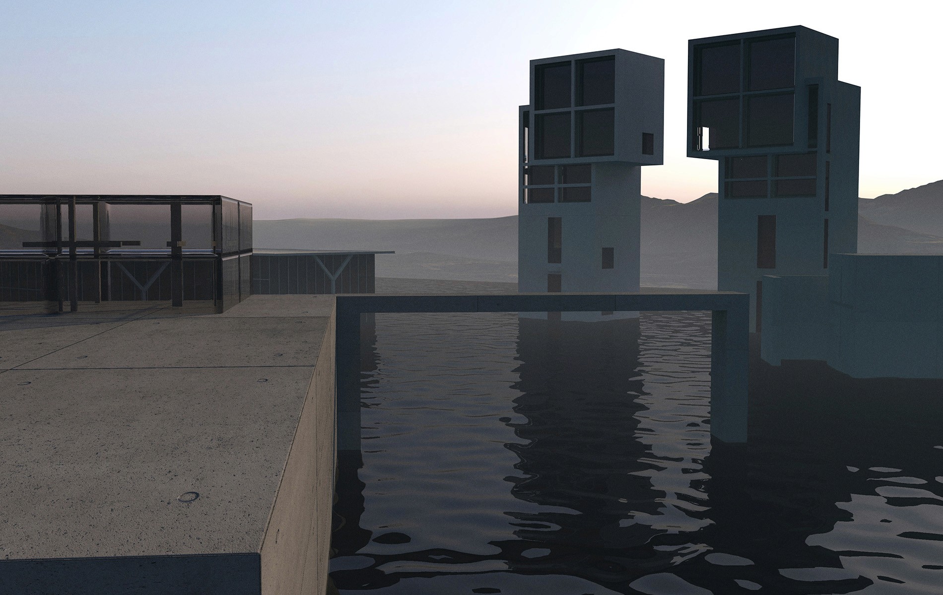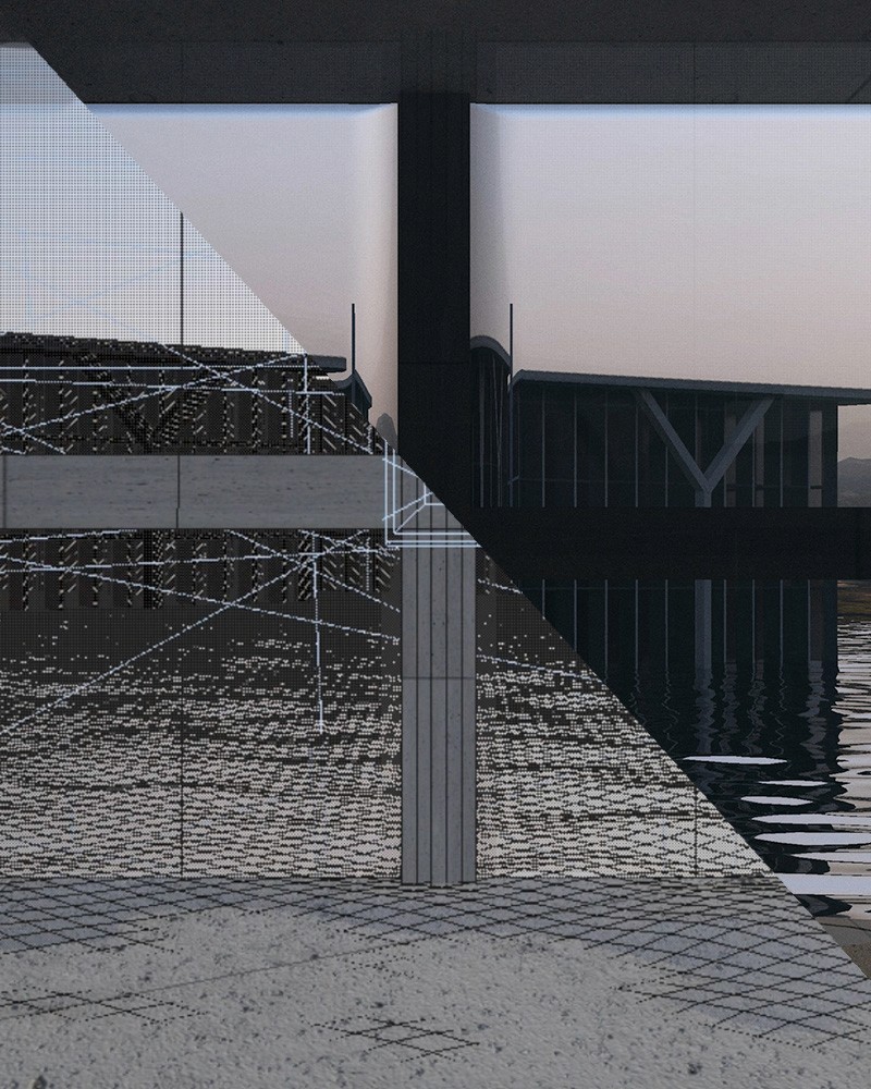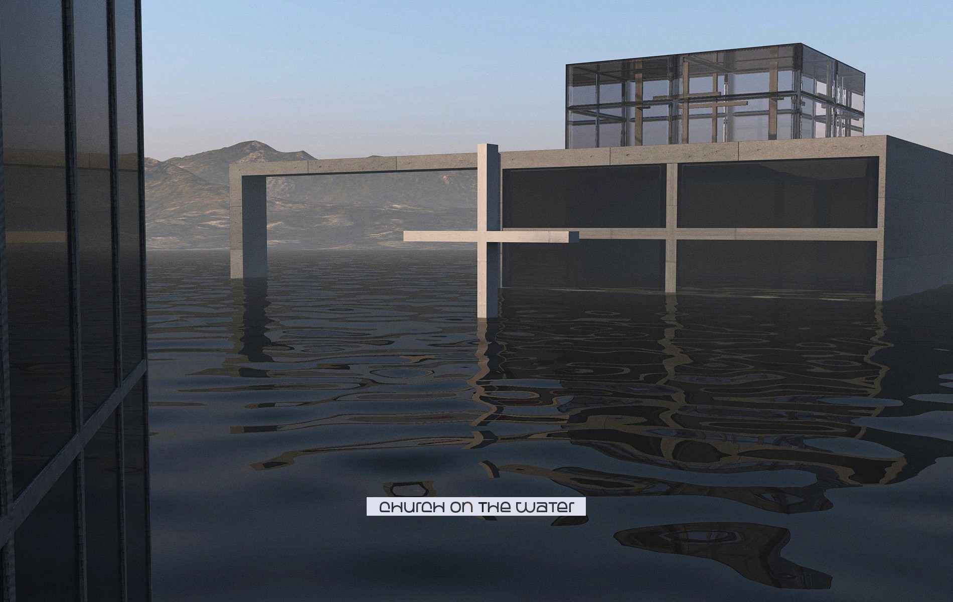 Le architetture sono state raffigurate immerse in un lago artificiale, uno spazio liquido e indefinito che, attraverso il riflesso, crea un forte contrasto con la loro staticità e massa materica. L’interazione tra il cemento e l’acqua simboleggia il dialogo tra immobilità e movimento che caratterizza l’opera di Ando.